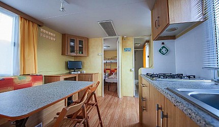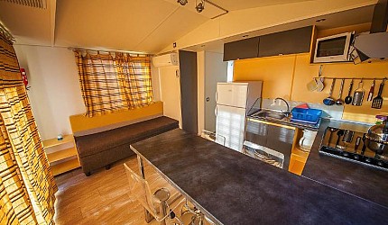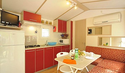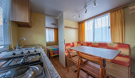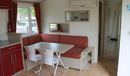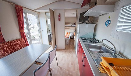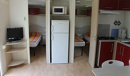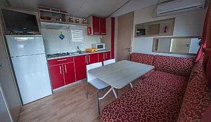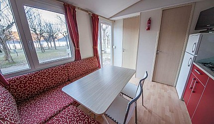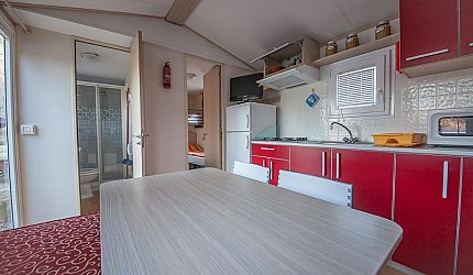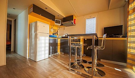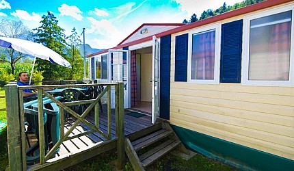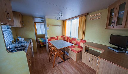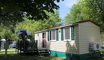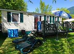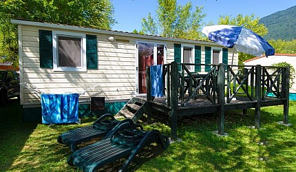 Komfortables Mobilheim ideal für die ganze Familie. In einer ruhigen Lage, nahe des Biotops und des Levicosees gelegen. Hunde sind in diesen Chalets zugelassen.