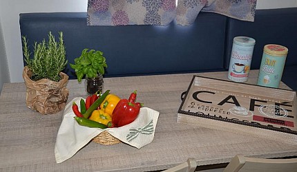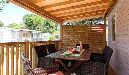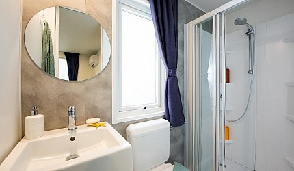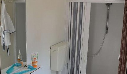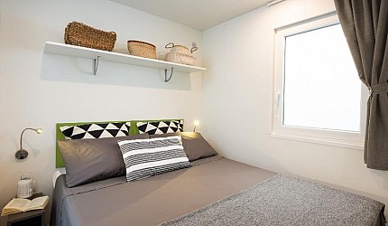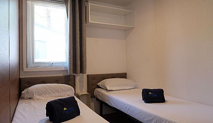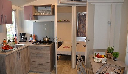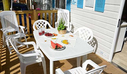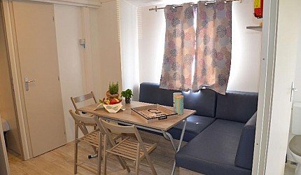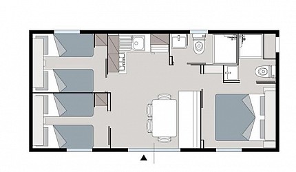 Deze comfortabele en functionele stacaravan met twee slaapkamers en een woonkamer is speciaal ontworpen voor vijf volwassenen en een kind. Een kamer met een tweepersoonsbed, de tweede kamer met twee eenpersoonsbedden en een klein bed aan de muur (geschikt voor een persoon van max. 150 cm en 60 kg). In de woonkamer kan van de bank een zesde bed worden gemaakt. De keuken heeft een koelkast met kleine vriezer, kookplaat, gootsteen en stopcontacten, plus alles wat je nodig hebt voor zes personen; badkamer met douche, wastafel en toilet. Comfortabel tuinmeubilair om buiten van de stacaravan te genieten: tafel en stoelen, parasol, twee ligstoelen of luie stoelen en, als de camping het toelaat, een kookplaat. Als de buitenkant van de stacaravan een overdekt of gedeeltelijk overdekt terras, luifel of gazebo heeft, is de parasol niet bij het tuinmeubilair inbegrepen. In de beschrijvingen van de afzonderlijke campings staat vermeld waar onze stacaravans zijn uitgerust met een terras, gazebo, luifel en/of zonnescherm.