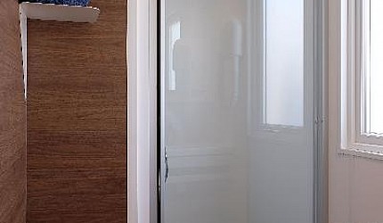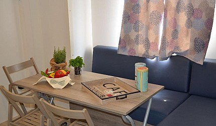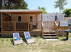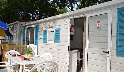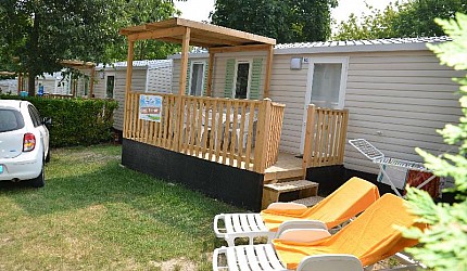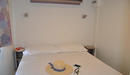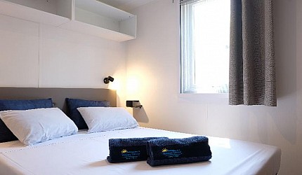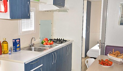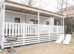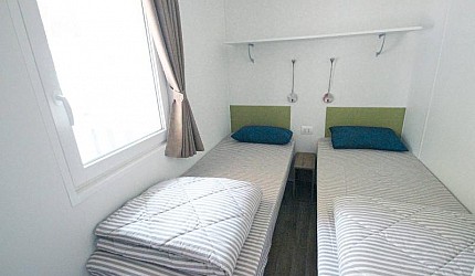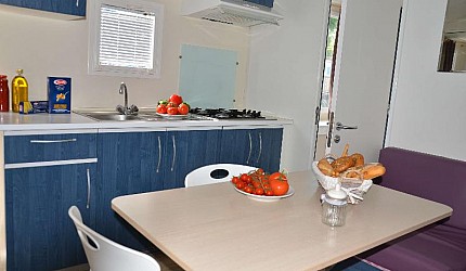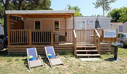 De stacaravan Happy Superior, de eerste van de Happy Camp-accommodaties uitgerust met 2 complete badkamers, bestaat uit: een moderne woonkamer met een lichte dubbele glazen deur (in de woonkamer is er ook een Bluetooth-luidspreker en een USB-aansluiting); een badkamer met wastafel, spiegel, douche, toilet en haardroger; een keuken voorzien van koelkast met vriesvak, vierpits kookplaat en spoelbak; een tweepersoonsslaapkamer met eigen interne badkamer, compleet met wastafel, spiegel, douche en toilet; twee andere slaapkamers met elk twee eenpersoonsbedden. Extra slaapruimte in de woonkamer, vertegenwoordigd door de zitplaats met kussens rond de eettafel.
