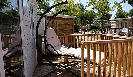 Buiten is een groot en comfortabel, volledig overdekt houten terras ingericht met een tafel, stoelen, twee ligstoelen of ligstoelen, een hangende fauteuil, een houtskoolbarbecue en een kleine elektrische kookplaat.