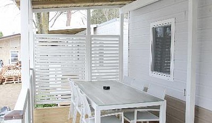 Deze comfortabele accommodatie heeft een modern design en bestaat uit een slaapkamer met tweepersoonsbed en twee slaapkamers met elk 2 aparte bedden. In de vertrekkamer vind je een zitgedeelte (te gebruiken als extra slaapgedeelte voor één persoon), twee bluetooth speakers en een usb-aansluiting. Verduisteringsschermen zijn zowel in de woonkamer als in de slaapkamers voorzien. Een koelkast met vriezer, vierpits kookplaat en een gootsteen vormt de keuken. Er is een badkamer met douche en wastafel en een apart toilet met wastafel, spiegel en haardroger. Buiten vindt u het tuinmeubilair bestaande uit: tafel met stoelen, twee ligbedden, hangende schommel en een barbecue of een elektrische grill (indien toegestaan door de camping). Onze stacaravans Happy Premium Zicht op het Meer zijn voorzien van een half overdekt houten terras.