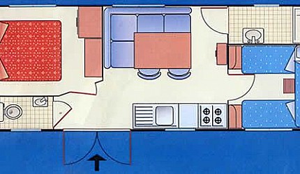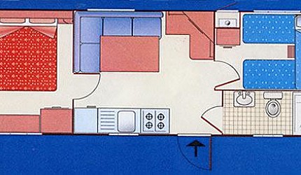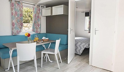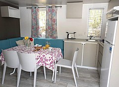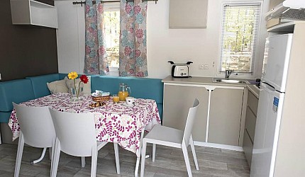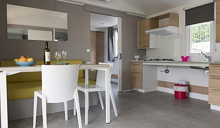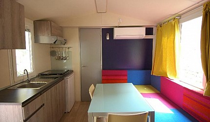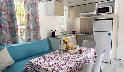 Le due camere sono separate dalla zona giorno composta dall'angolo cottura attrezzato all'uso ed equipaggiata con frigorifero e piano cottura a gas e il soggiorno. All'interno della casamobile sono presenti anche Tv-sat, aria condizionata ed internet via cavo. Ogni casetta ha la propria terrazza esterna con tenda parasole, tavolino e sedie e posto auto nelle vicinanze.
