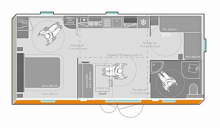 Casamobile composta da 2 camere da letto, una matrimoniale e la seconda doppia, angolo cottura attrezzato con forno a microonde, frigo e tostiera e macchina del caffé. Soggiornocon divano letto per 2 posti aggiuntivi. Bagno privato con doccia con sedile e schienale e aria condizionata. Struttura studiata perchè risulti facile l'accesso in sedia a rotelle a tutte le stanze