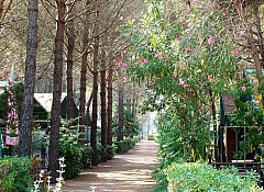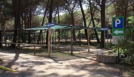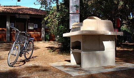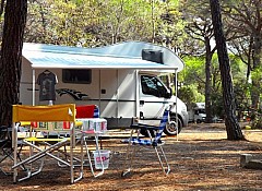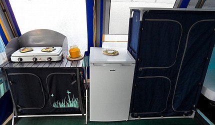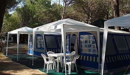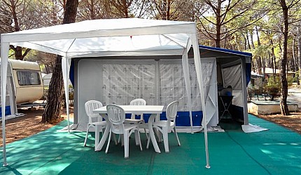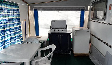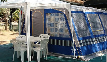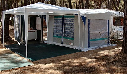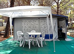 La Caravane (sans services internes) fait office de coin nuit avec 3 lits (un double + 1 simple) et des armoires. Attenante à la caravane se trouve une véranda semi-ouverte où est aménagée la kitchenette avec cuisinière, réfrigérateur et meuble équipé de vaisselle. À l'extérieur de la véranda se trouve un belvédère avec table et chaises sous la pinède.