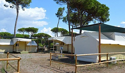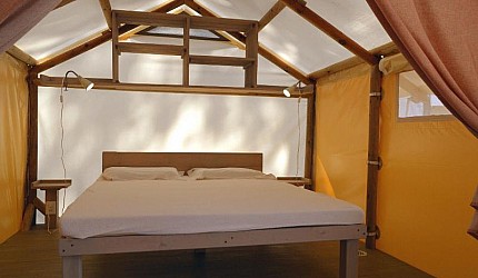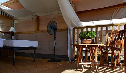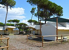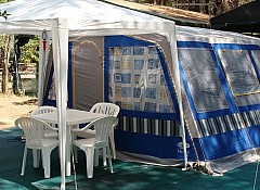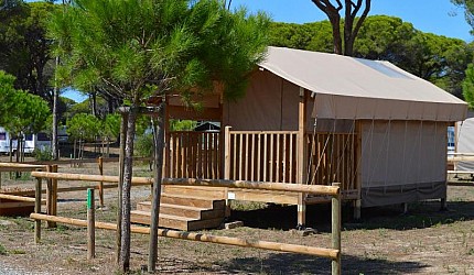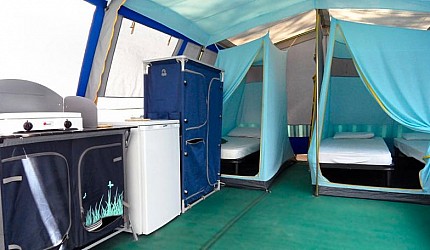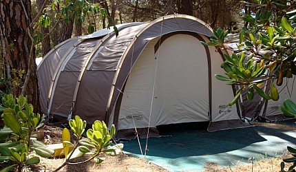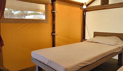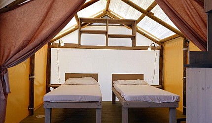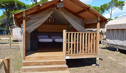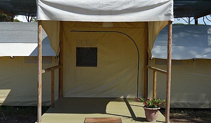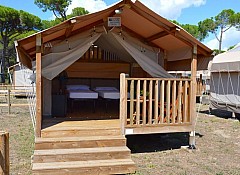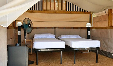 Les tentes SAFARI offrent un espace intérieur de 23m2. et un espace extérieur de 7,50 m2. La tente se compose de deux chambres, une double et une twin avec deux lits simples placés côte à côte. Il est possible d'ajouter un lit de camping dans chaque chambre. La cuisine équipée est dotée d'éléments hauts, d'une plaque vitrocéramique et d'un réfrigérateur. Équipement de cuisine de base. La véranda extérieure couverte fait office d'espace repas et détente et est aménagée avec une table 4 places et des chaises. Les tentes sont positionnées à quelques mètres de deux groupes de salles de bains communes. Ils sont situés dans un endroit très calme et bien aéré. Étendoir à linge disponible. Place de parking dans le parking intérieur incluse dans le prix. Les animaux ne sont pas admis