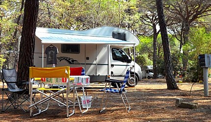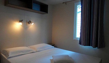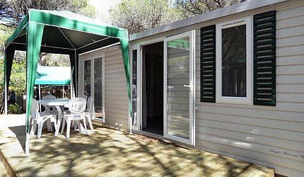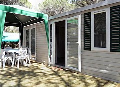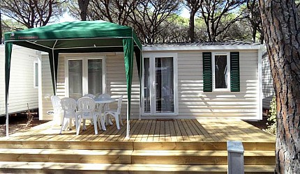 Mobil-homes Deluxe de 28 m2 pour 4+2 personnes répartis comme suit : kitchenette équipée de 4 feux, réfrigérateur avec petit congélateur, évier et matériel de cuisine de base, séjour avec table, chaises et canapé-lit double pouvant être ouvert si nécessaire, une chambre double , une chambre avec 2 lits simples placés côte à côte, salle d'eau avec grande douche, lavabo et WC, gazebo extérieur avec table et chaises de jardin. Étendoir à linge. Place de parking dans le parking intérieur incluse dans le prix. Animaux acceptés moyennant un supplément (max 2 par établissement).