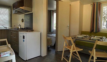Mobil-homes Deluxe de 28 m2 pour 4+2 personnes répartis comme suit : kitchenette équipée de 4 feux, réfrigérateur avec petit...