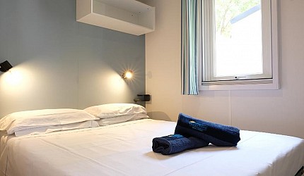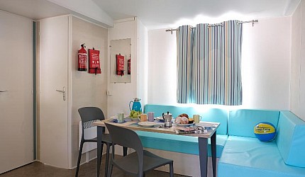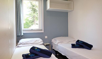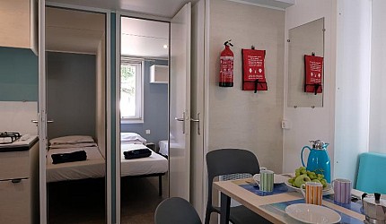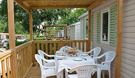 Il divanetto del soggiorno, inoltre, potrà essere utilizzato come settimo posto letto. La cucina è dotata di frigo con freezer, piano cottura a quattro fuochi e lavandino; completano l’interno bagno con wc, doccia e lavandino (in alcune case mobili il wc è separato dalla zona doccia). Le case mobili Happy Premium sono inoltre dotate di zanzariere oscuranti in soggiorno e nelle camere da letto. All’esterno, la fornitura da giardino tradizionale: tavolo con sedie, due sdraio o sedie reclinabili e, ove il campeggio lo permettesse, una piastra elettrica. La maggior parte delle case mobili Happy Premium sono dotate di terrazza in legno parzialmente coperta